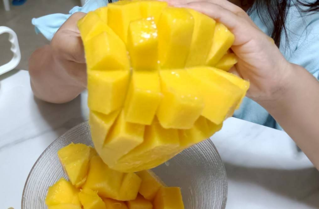 少しだけ皺のある、ピンクがかった黄色になったマンゴーが食べ頃です。