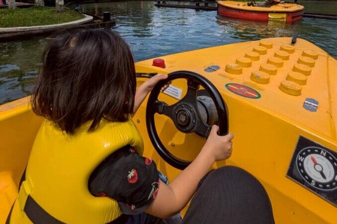 子どもはライフジャケットを着用して乗り込みます。2人乗りのボートです。