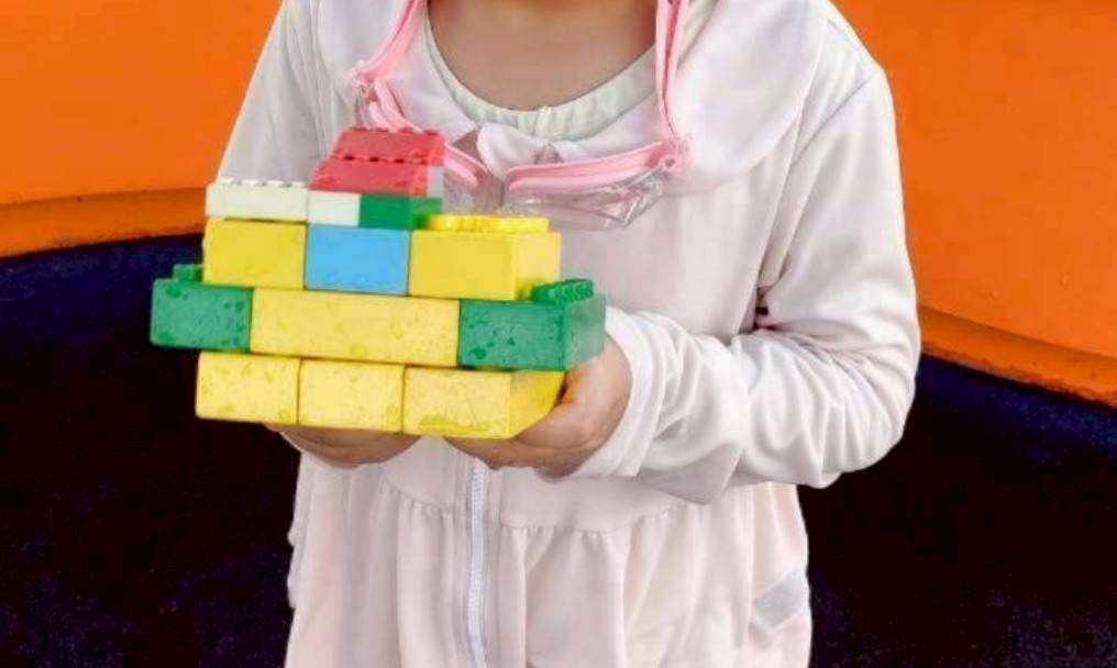 柔らかいレゴブロックや浮き輪が浮いている流れるプールです。8歳以下の子どもはライフジャケットを必ず着用します。